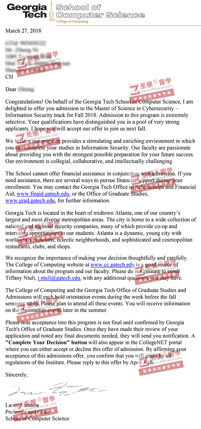录取结果:Georgia Institute of Technology佐治亚理工学院,MS in CS计算机硕士