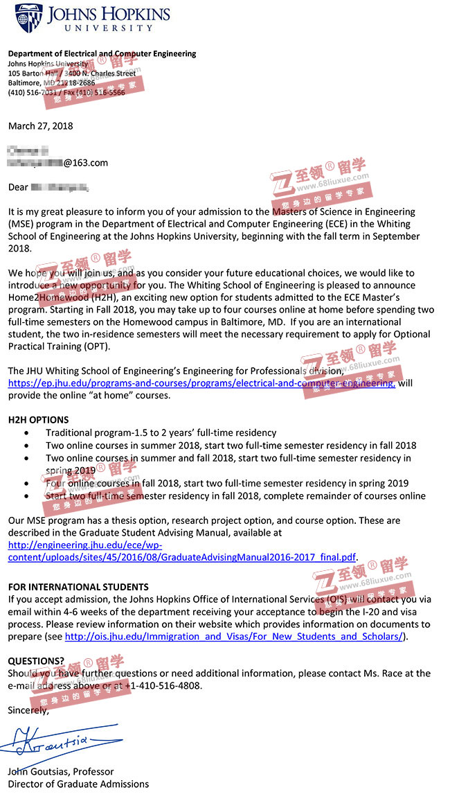录取结果:Johns Hopkins University约翰霍普金斯大学,MS in Electrical and Computer Engineering (ECE)电子与计算机工程硕士