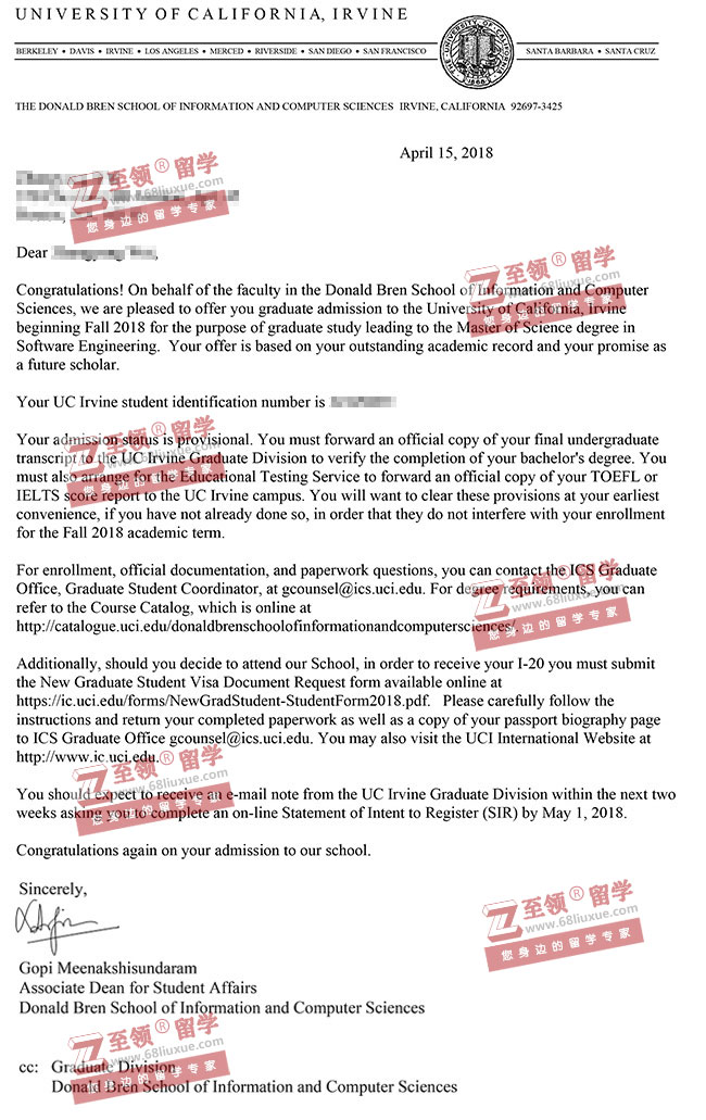 录取结果:University of California, Irvine加州大学欧文分校,MS in Software Engineering 软件工程硕士