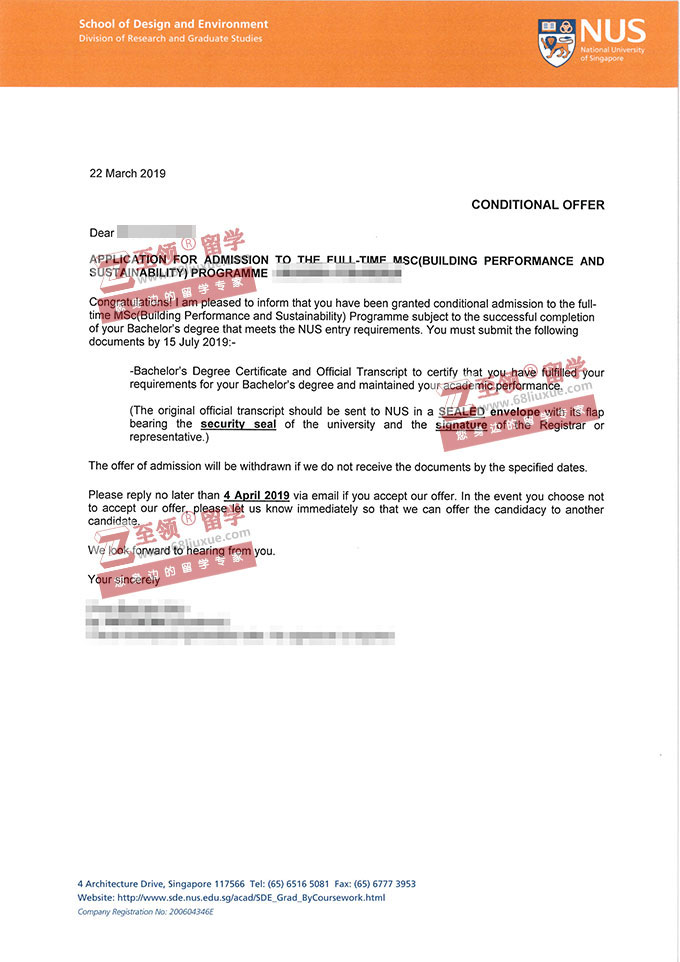 录取结果:National University of Singapore, MSc (Building Performance and Sustainability) 新加坡国立大学建筑工程硕士