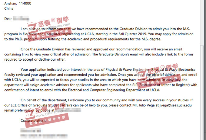 在至领留学团队与C同学共同的努力配合下,最终获得了UCLA电子工程硕士的录取,真是可喜可贺!