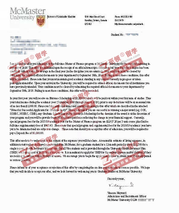 在大家的共同配合之下,H同学终获得麦克马斯特大学金融硕士OFFER!圆了她的留学梦想!
