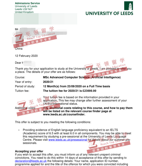 录取结果:The University of Leeds,MSc Advanced Computer Science(Artificial Intelligence)利兹大学高级计算机科学(人工智能)硕士录取