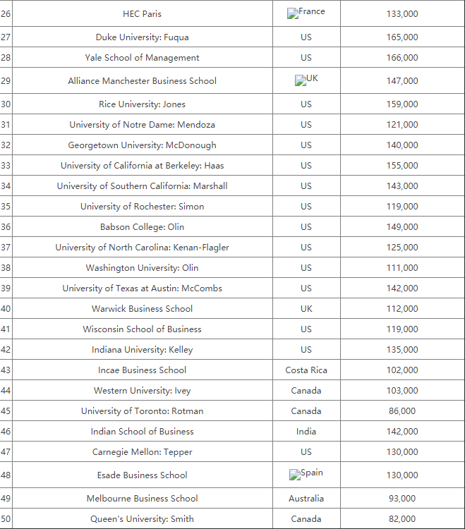 金融MBA是MBA工商管理硕士下设方向之一,学费在1.7-5.5万英镑之间。FT金融时报杂志2017年也曾评选出全球50强金融MBA院校: