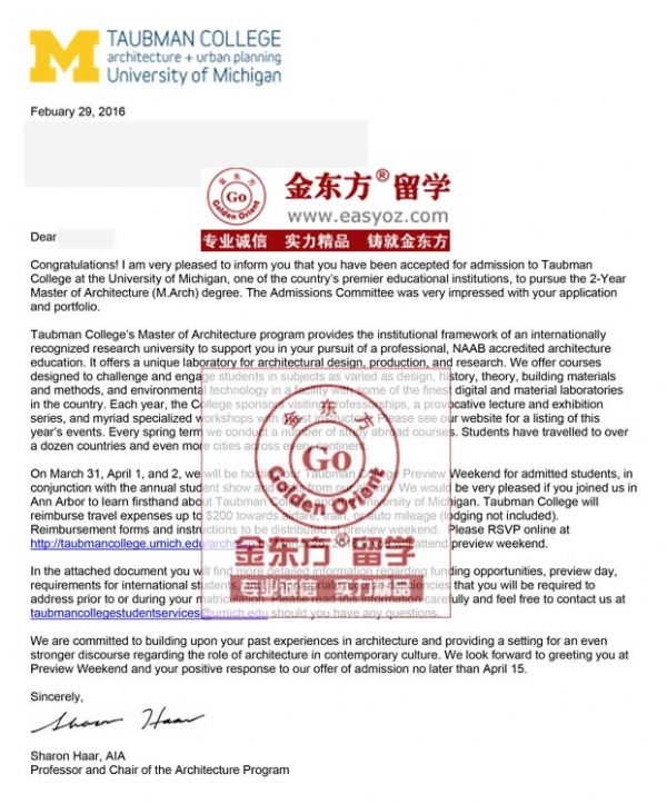 终于,在二月的尾声,我们终于收到了学校录取的邮件。在看到录信邮件的那一刻,学生自己都不敢相信。学生说:“我没有想到在托福成绩没有达到100,学校竟然真的录了。”的确,能够从waiting list 这一渺茫的希望中脱颖而出,成为真正的admitted student, 确实令人意外。密歇根大学安娜堡分校建筑专业的托福最低分要求是100分,根据以往的申请经验,低于100分的托福这个学校是不会录取的,但是W同学和金东方留学的老师们一直没有放弃这个学校的申请,经过大家的努力,最终W同学以99分的成绩成功申请到这所世界顶级建筑类名校!