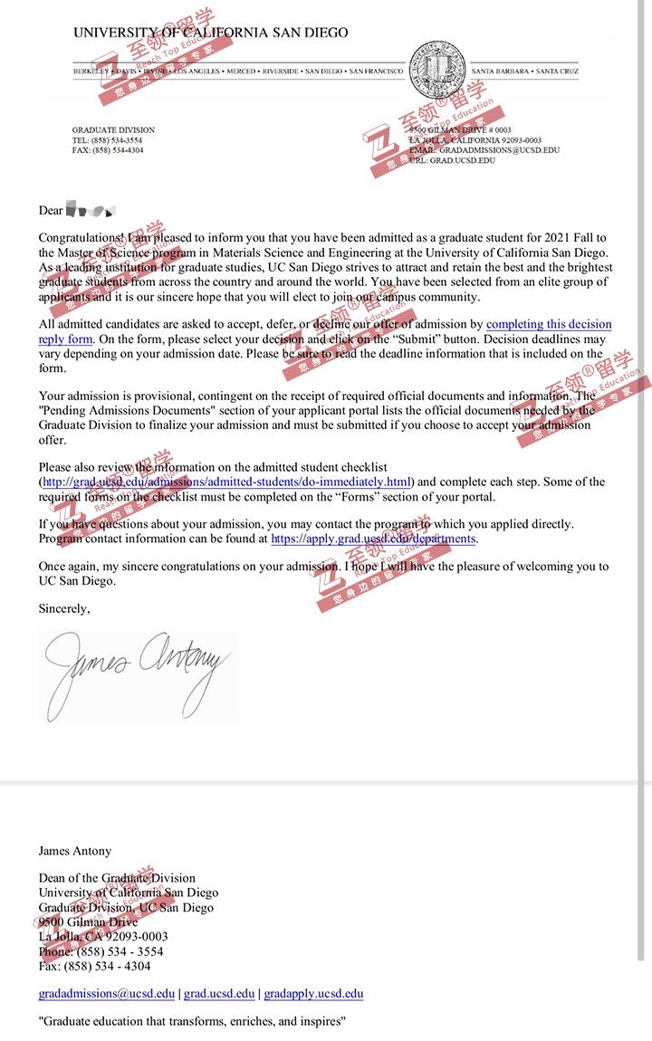 录取结果:UCSD, MS in Materials Science and Engineering加州圣地亚哥材料科学与工程硕士录取