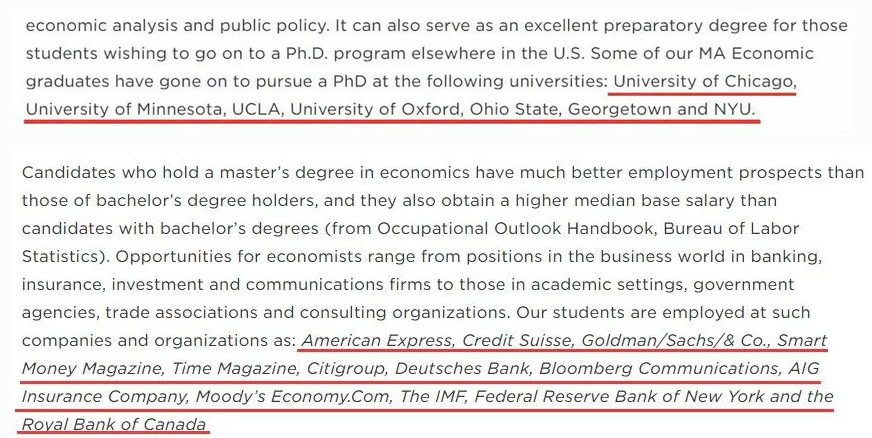 就业去向主要集中于经济和金融领域,遍布于全球各类金融机构、政府和国际组织、私营企业。比如如瑞士信贷、加拿大皇家银行,国际货币基金组织,彭博通讯、时代周刊,AIG保险公司等。