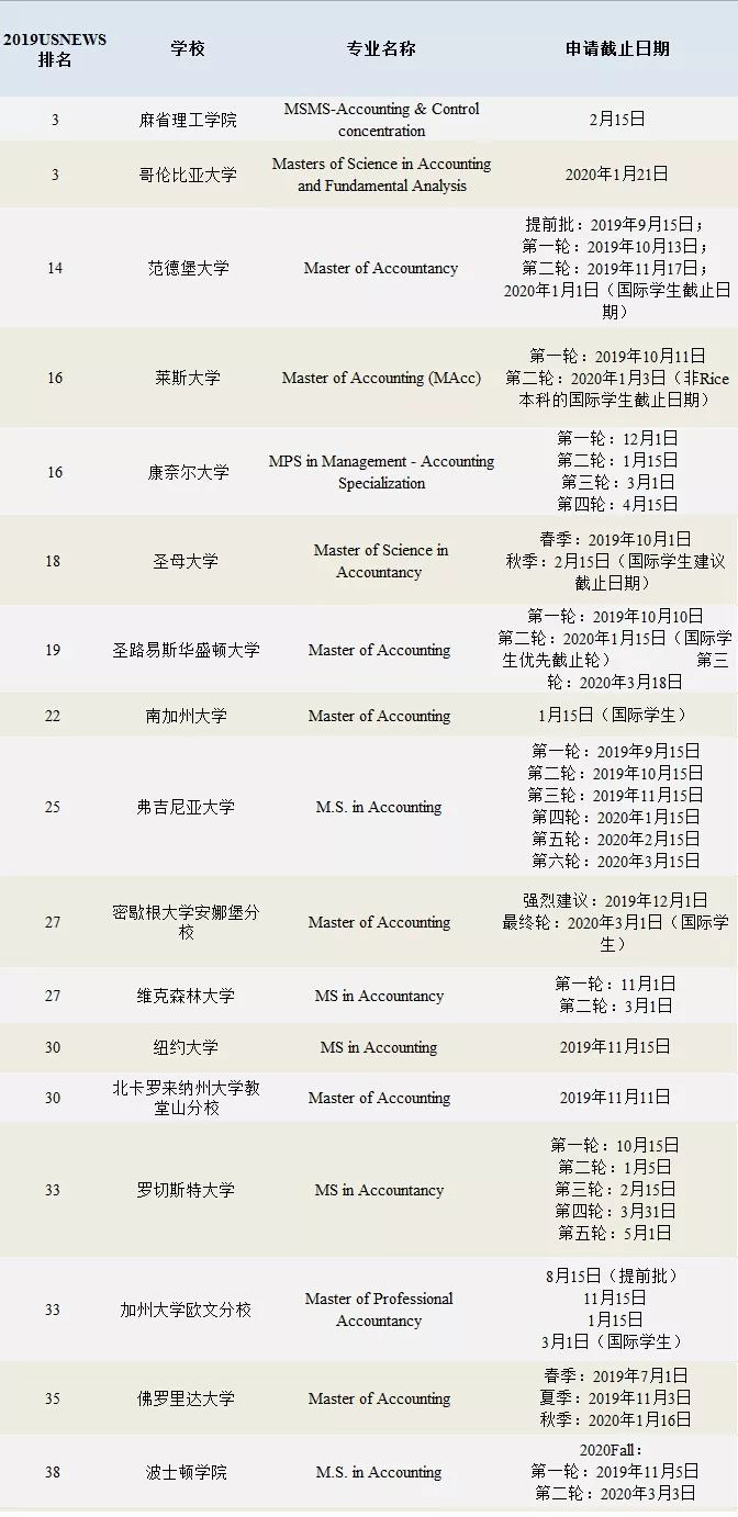 美国会计硕士一般设在商学院,综合排名TOP100的学校中,有70多个学校开设了会计项目。下面小编给大家整理了美国排名前50大学的会计硕士项目及申请截止日期: