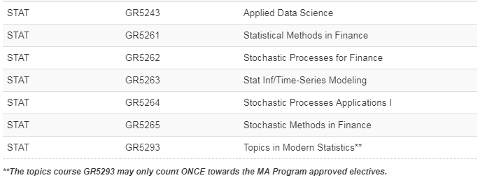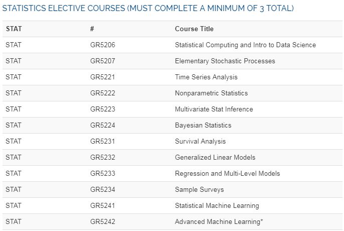 哥大统计硕士 full-time 项目课程分3个学期完成,需要修满至少30个学分,含4门必修课和6门选修课(其中3门必需是统计课程)。