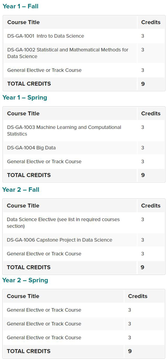 数据科学项目要求学生修完36个学分,项目推荐的修读时间是两年,四个学期。